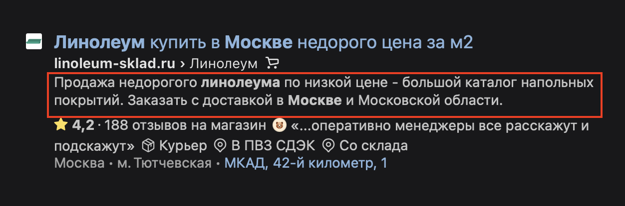 Description - еще один важный метатег страницы сайта, на основании которого может формироваться описание страницы в результатах поиска. В него попадает информативный и релевантный запросу текст.